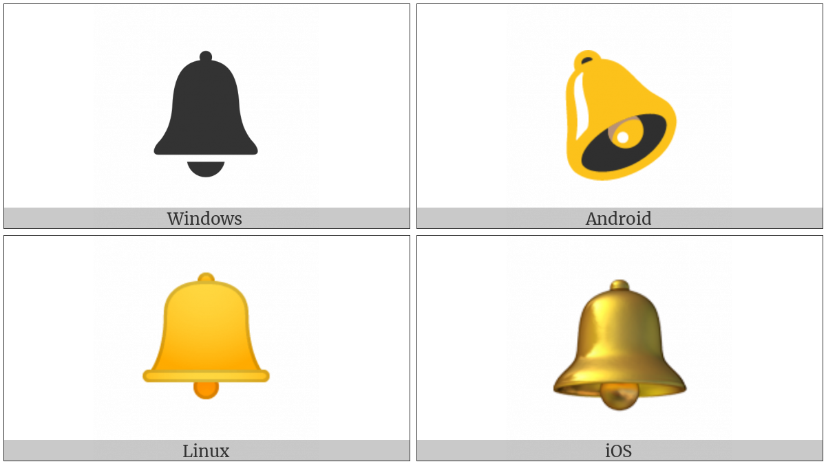 The image below shows how the “Bell” symbol might look like on different operating systems. If the font in which this web site is displayed does not contain the symbol and there is no fallback font able to render it, you can use the image below to get an idea of what it should look like.