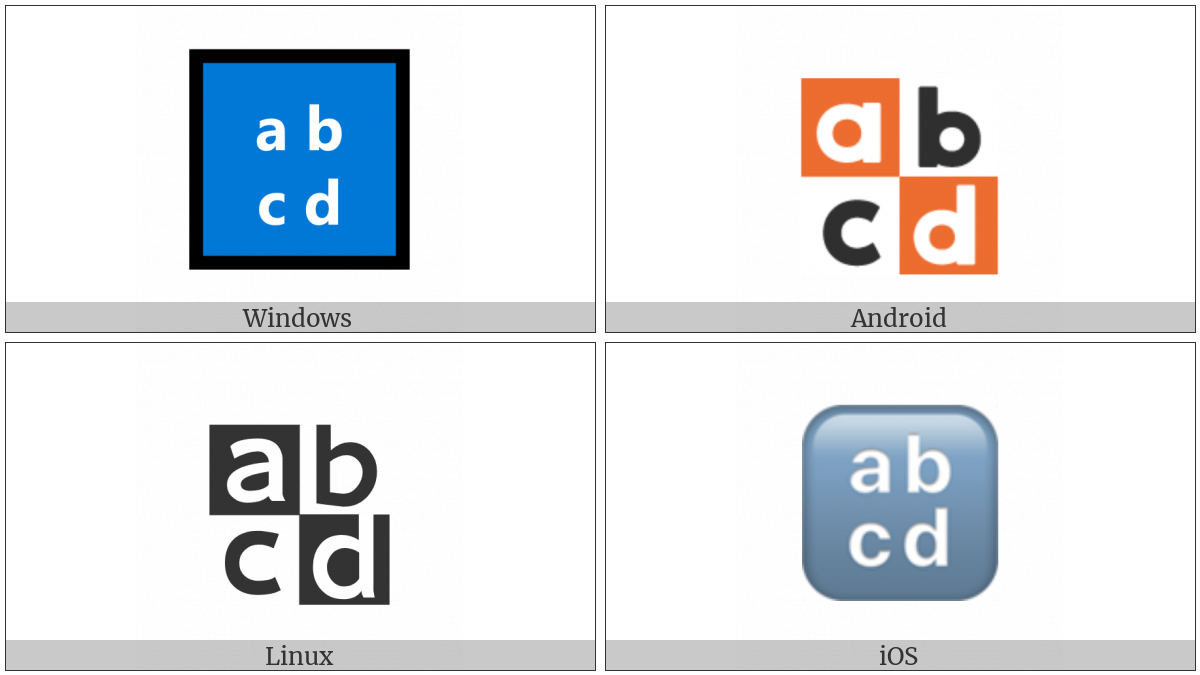The image below shows how the “Input Symbol For Latin Small Letters” symbol might look like on different operating systems. If the font in which this web site is displayed does not contain the symbol and there is no fallback font able to render it, you can use the image below to get an idea of what it should look like.