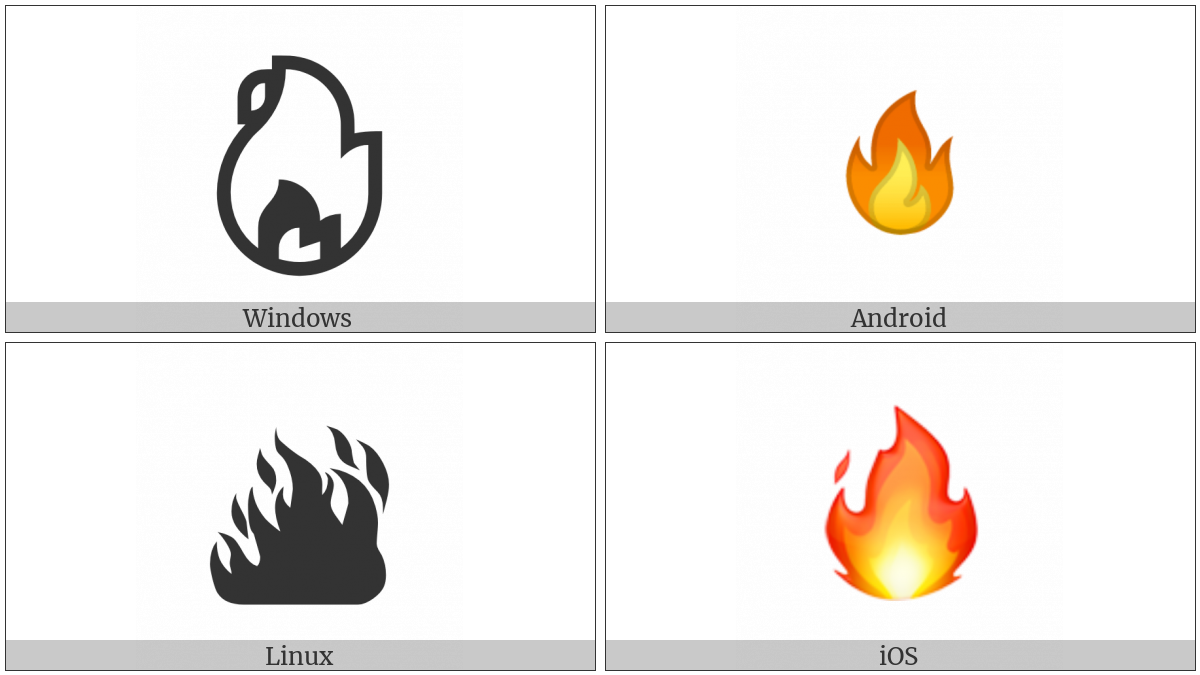 The image below shows how the “Fire” symbol might look like on different operating systems. If the font in which this web site is displayed does not contain the symbol and there is no fallback font able to render it, you can use the image below to get an idea of what it should look like.