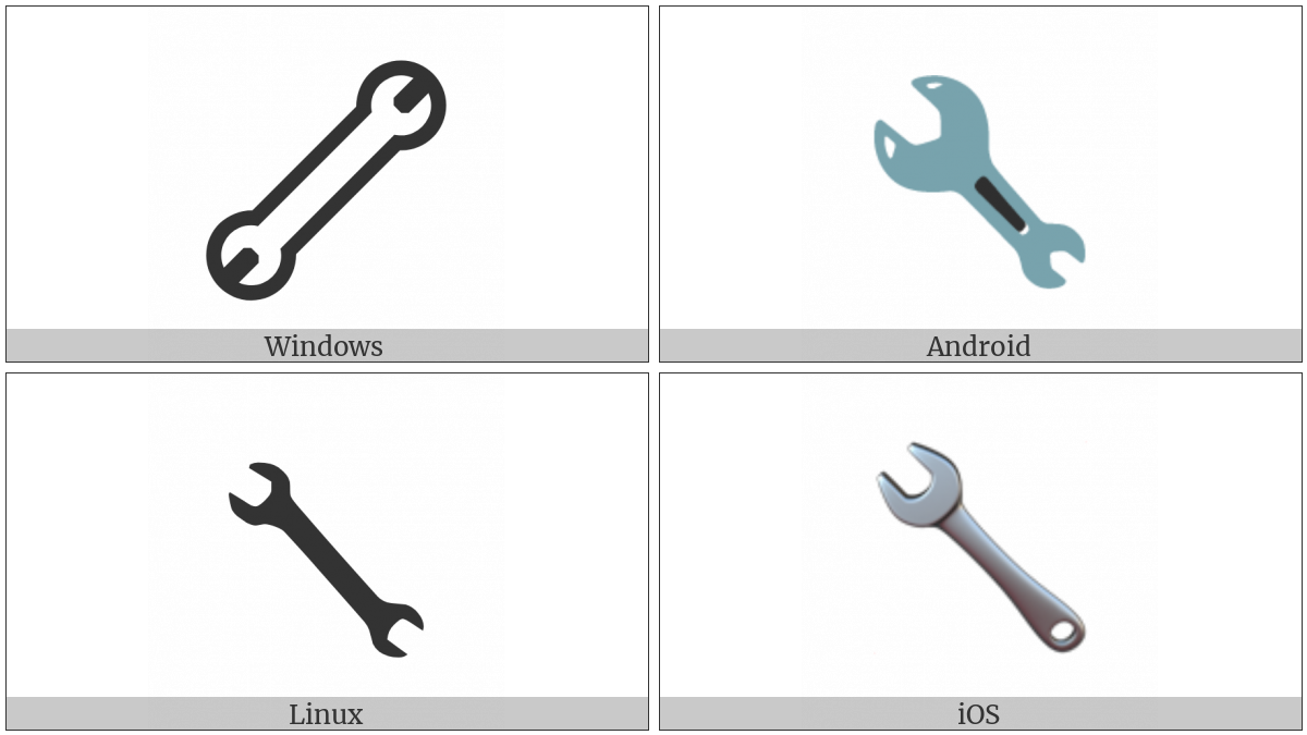 The image below shows how the “Wrench” symbol might look like on different operating systems. If the font in which this web site is displayed does not contain the symbol and there is no fallback font able to render it, you can use the image below to get an idea of what it should look like.