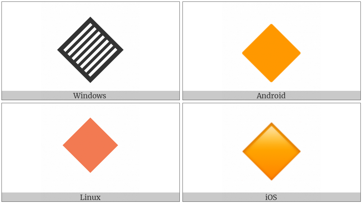 The image below shows how the “Large Orange Diamond” symbol might look like on different operating systems. If the font in which this web site is displayed does not contain the symbol and there is no fallback font able to render it, you can use the image below to get an idea of what it should look like.