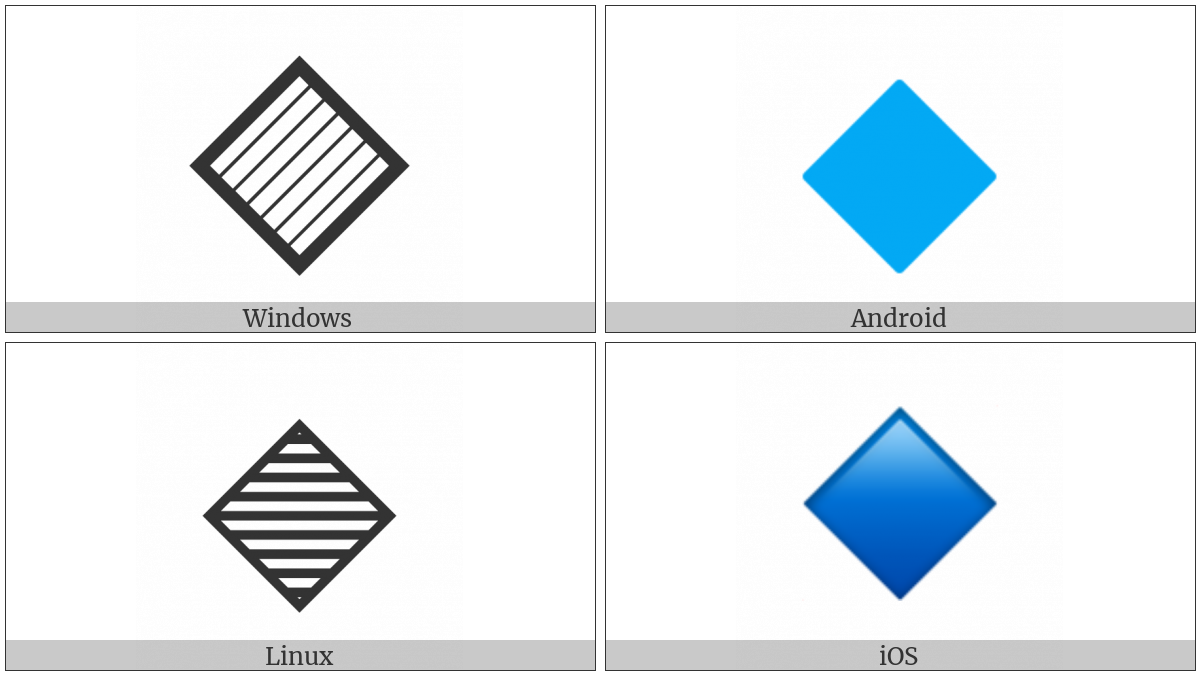 The image below shows how the “Large Blue Diamond” symbol might look like on different operating systems. If the font in which this web site is displayed does not contain the symbol and there is no fallback font able to render it, you can use the image below to get an idea of what it should look like.