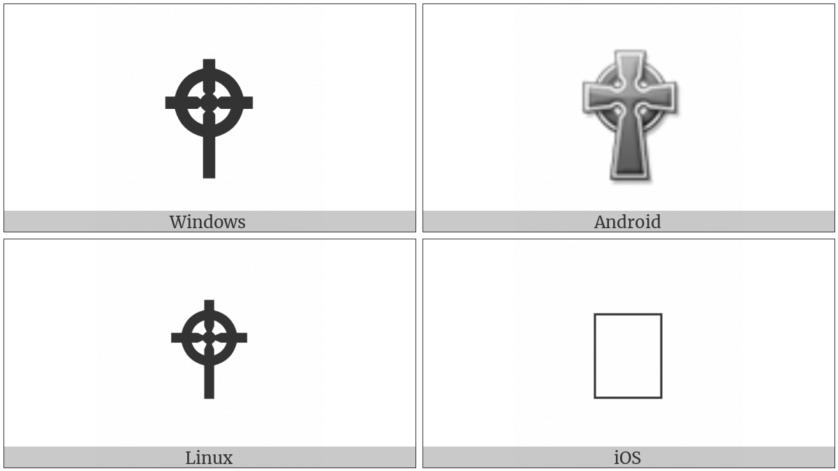 The image below shows how the “Celtic Cross” symbol might look like on different operating systems. If the font in which this web site is displayed does not contain the symbol and there is no fallback font able to render it, you can use the image below to get an idea of what it should look like.