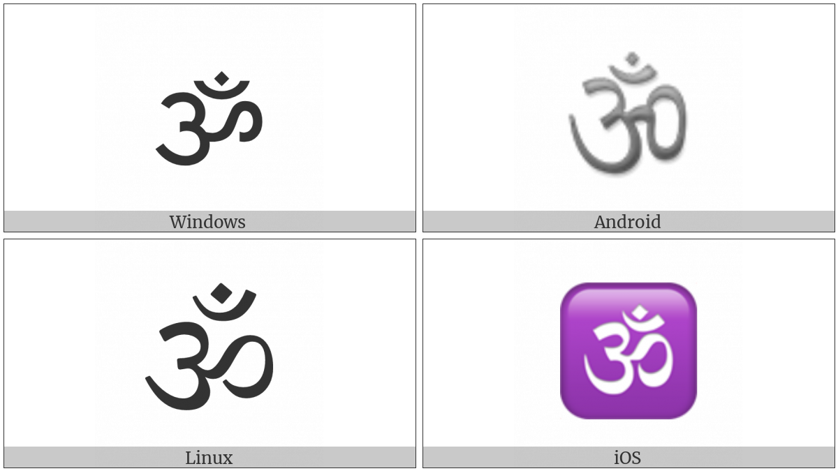 The image below shows how the “Om Symbol” symbol might look like on different operating systems. If the font in which this web site is displayed does not contain the symbol and there is no fallback font able to render it, you can use the image below to get an idea of what it should look like.