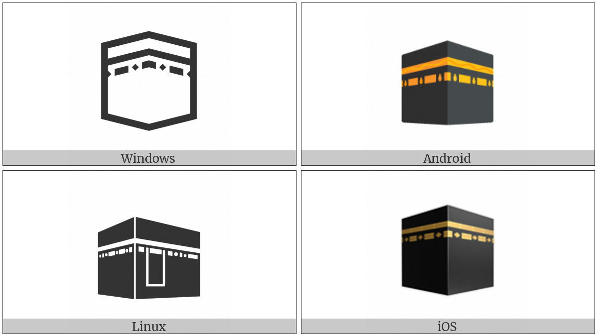 The image below shows how the “Kaaba” symbol might look like on different operating systems. If the font in which this web site is displayed does not contain the symbol and there is no fallback font able to render it, you can use the image below to get an idea of what it should look like.