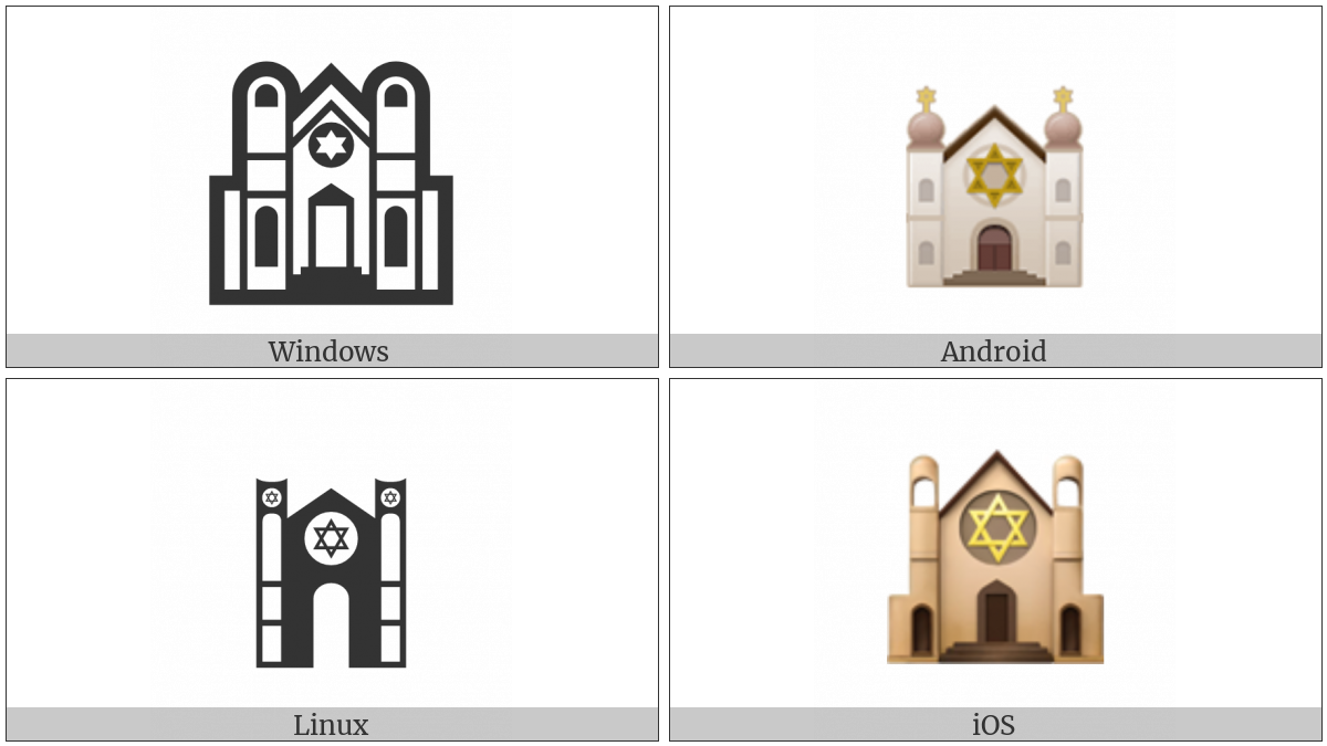 The image below shows how the “Synagogue” symbol might look like on different operating systems. If the font in which this web site is displayed does not contain the symbol and there is no fallback font able to render it, you can use the image below to get an idea of what it should look like.
