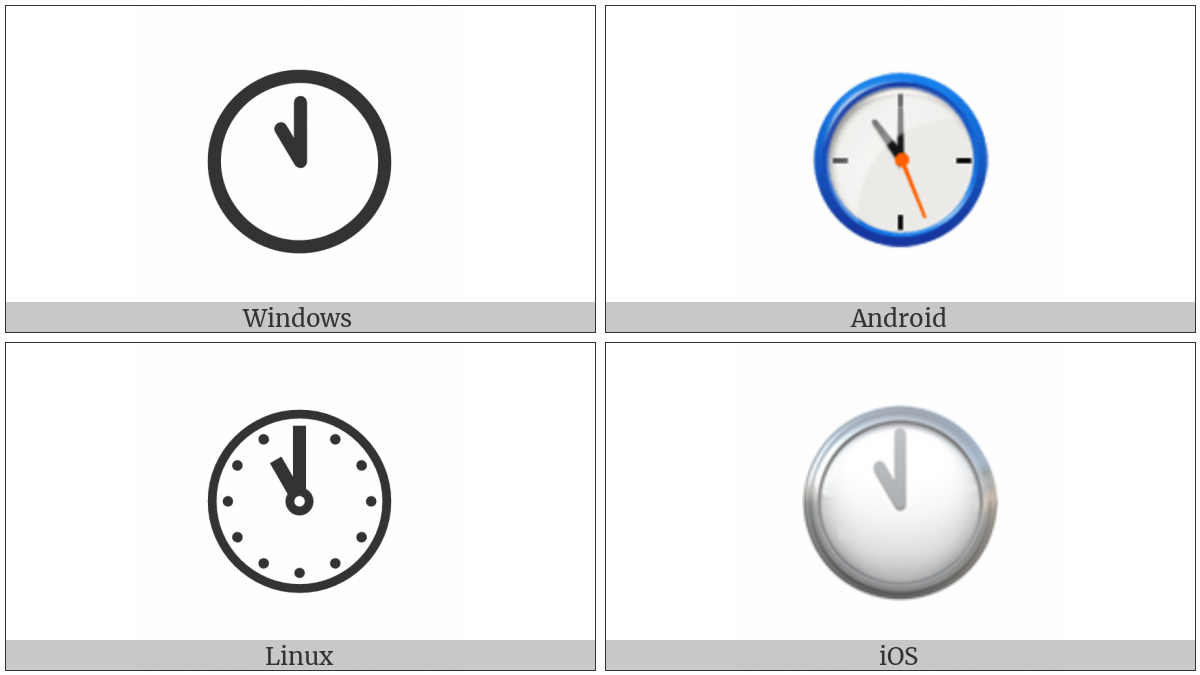 The image below shows how the “Clock Face Eleven Oclock” symbol might look like on different operating systems. If the font in which this web site is displayed does not contain the symbol and there is no fallback font able to render it, you can use the image below to get an idea of what it should look like.