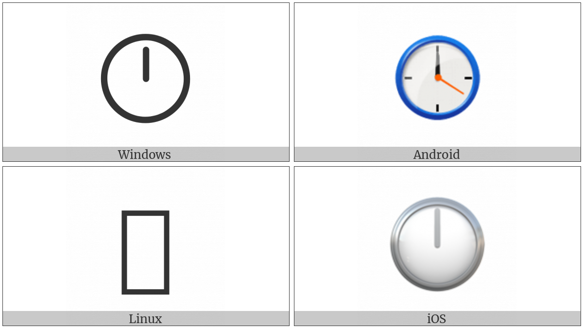 The image below shows how the “Clock Face Twelve Oclock” symbol might look like on different operating systems. If the font in which this web site is displayed does not contain the symbol and there is no fallback font able to render it, you can use the image below to get an idea of what it should look like.