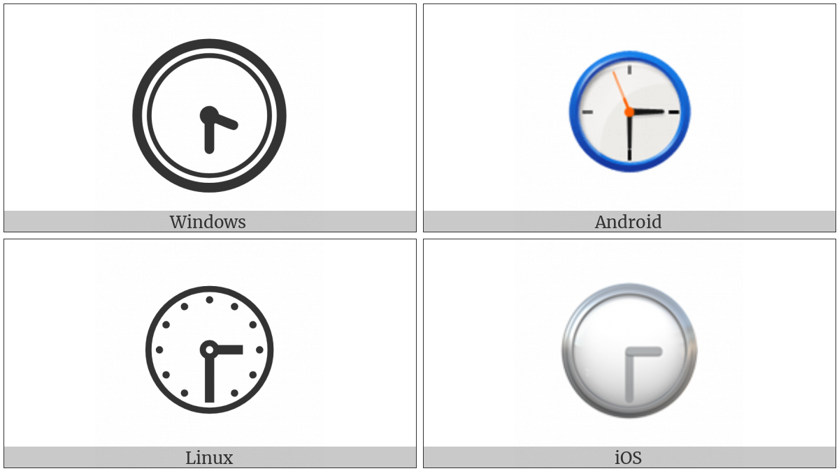 The image below shows how the “Clock Face Three-Thirty” symbol might look like on different operating systems. If the font in which this web site is displayed does not contain the symbol and there is no fallback font able to render it, you can use the image below to get an idea of what it should look like.