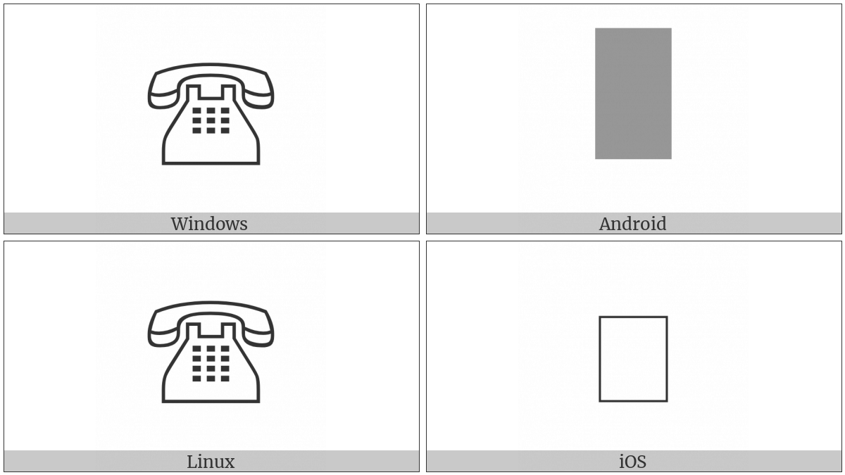The image below shows how the “White Touchtone Telephone” symbol might look like on different operating systems. If the font in which this web site is displayed does not contain the symbol and there is no fallback font able to render it, you can use the image below to get an idea of what it should look like.