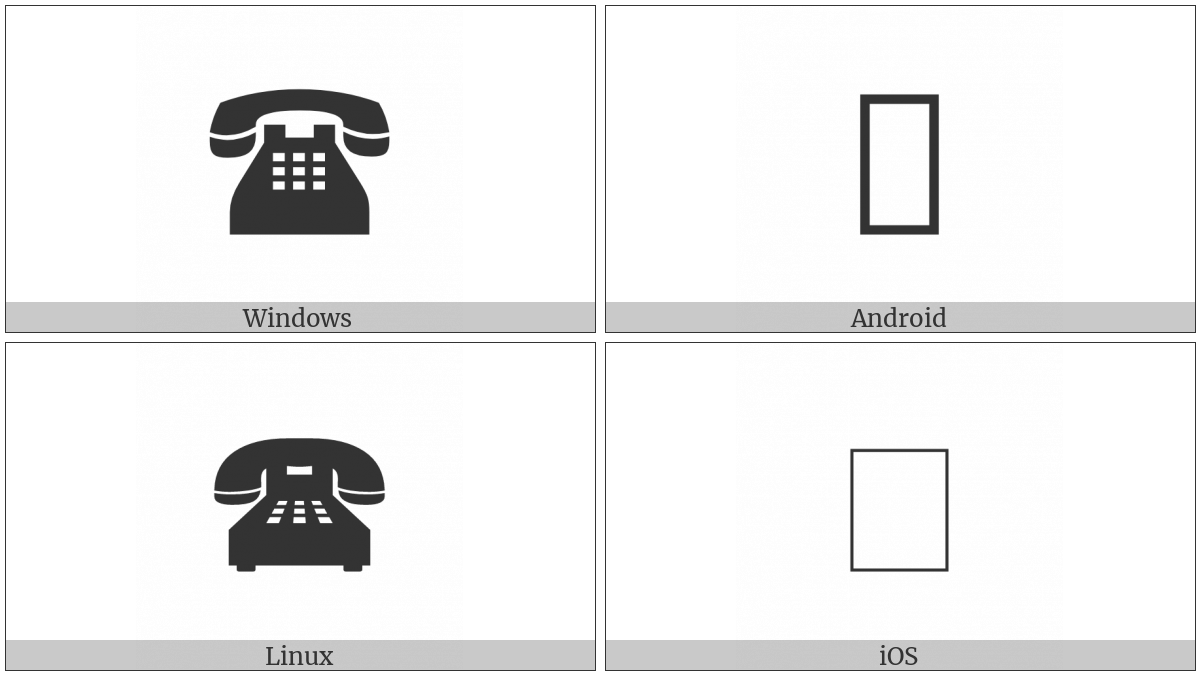The image below shows how the “Black Touchtone Telephone” symbol might look like on different operating systems. If the font in which this web site is displayed does not contain the symbol and there is no fallback font able to render it, you can use the image below to get an idea of what it should look like.