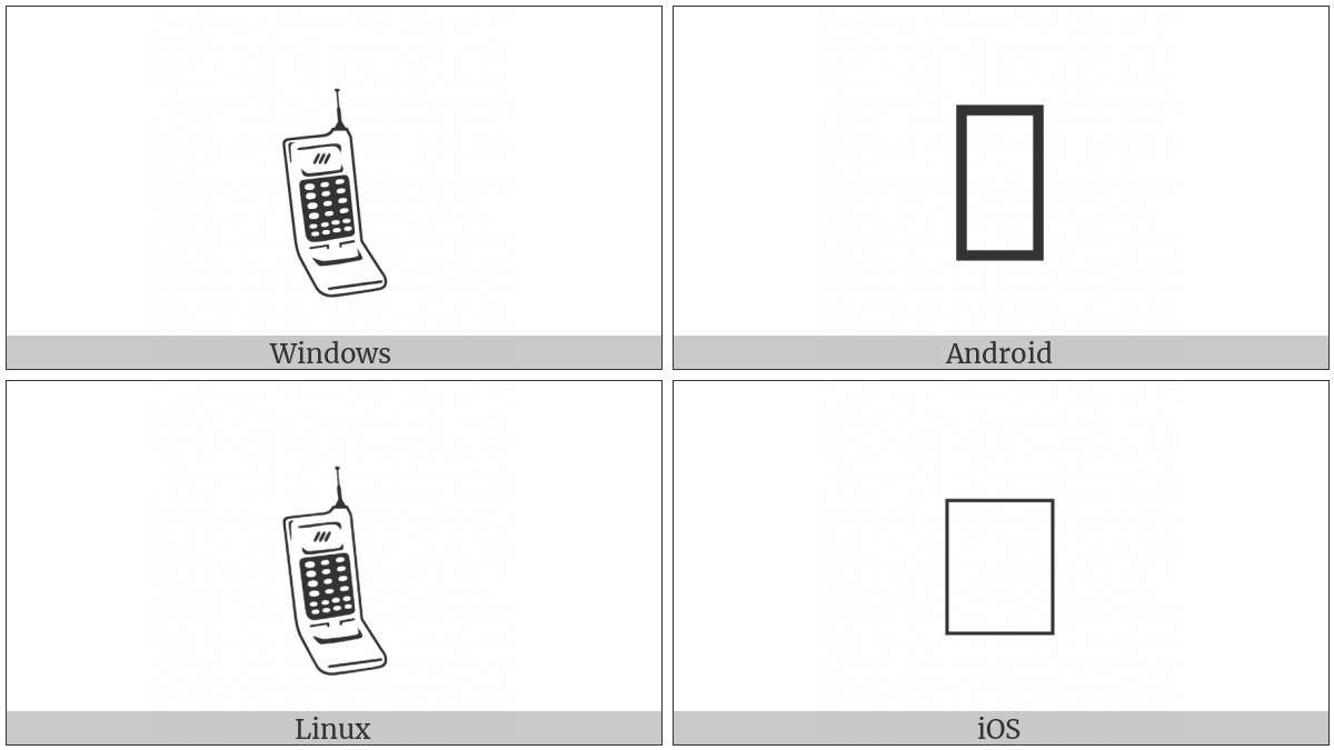 The image below shows how the “Clamshell Mobile Phone” symbol might look like on different operating systems. If the font in which this web site is displayed does not contain the symbol and there is no fallback font able to render it, you can use the image below to get an idea of what it should look like.