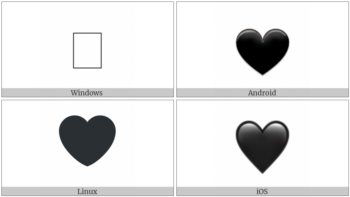 The image below shows how the “Black Heart” symbol might look like on different operating systems. If the font in which this web site is displayed does not contain the symbol and there is no fallback font able to render it, you can use the image below to get an idea of what it should look like.