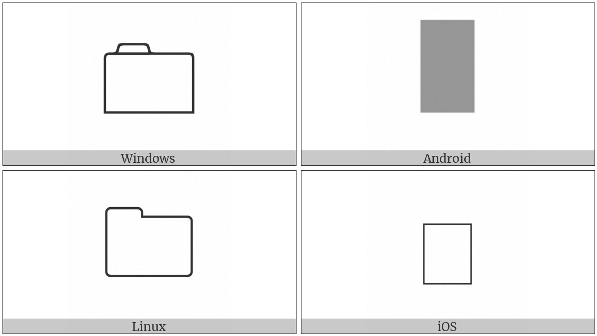 The image below shows how the “Folder” symbol might look like on different operating systems. If the font in which this web site is displayed does not contain the symbol and there is no fallback font able to render it, you can use the image below to get an idea of what it should look like.