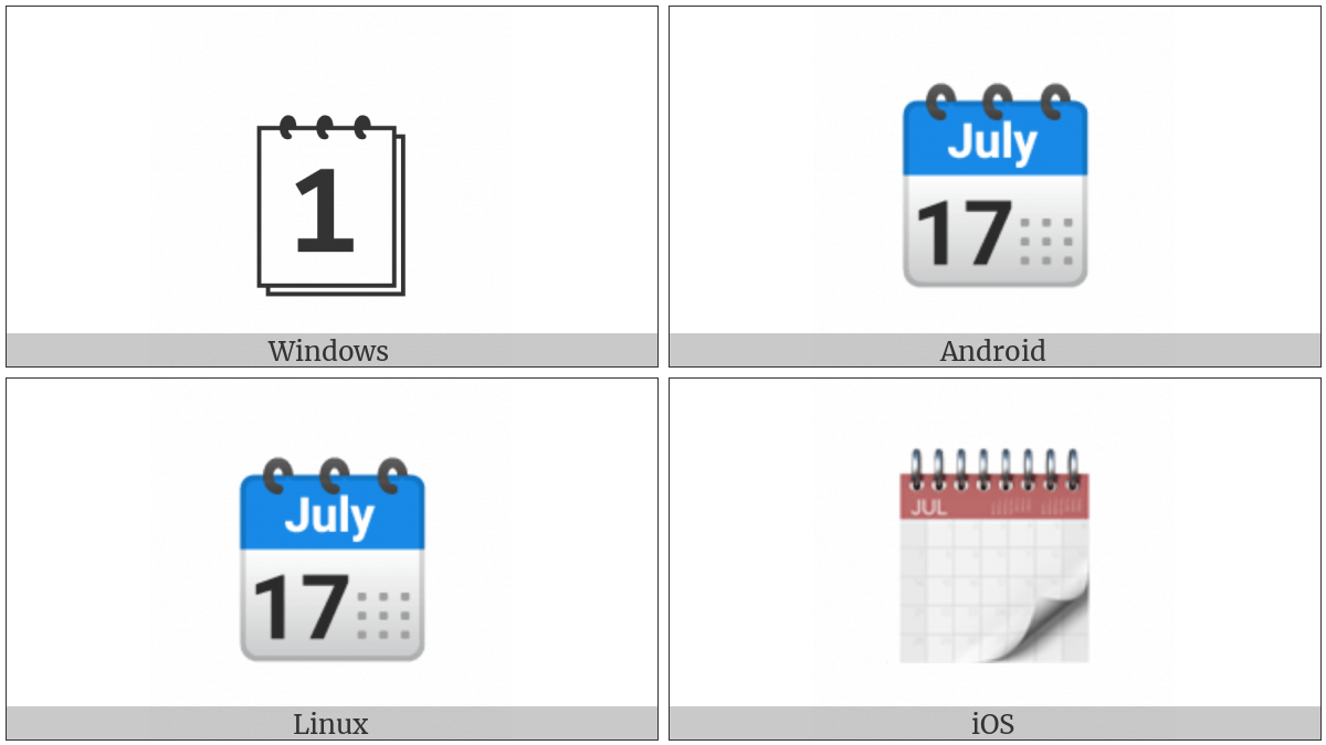 The image below shows how the “Spiral Calendar Pad” symbol might look like on different operating systems. If the font in which this web site is displayed does not contain the symbol and there is no fallback font able to render it, you can use the image below to get an idea of what it should look like.
