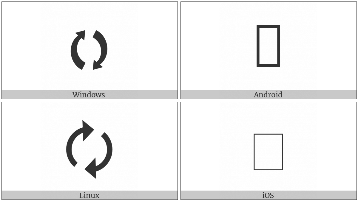 The image below shows how the “Clockwise Right And Left Semicircle Arrows” symbol might look like on different operating systems. If the font in which this web site is displayed does not contain the symbol and there is no fallback font able to render it, you can use the image below to get an idea of what it should look like.