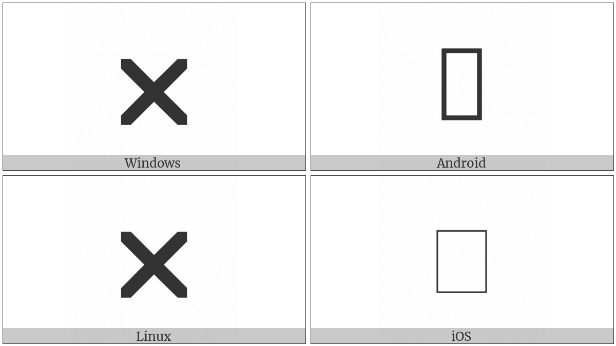 The image below shows how the “Cancellation X” symbol might look like on different operating systems. If the font in which this web site is displayed does not contain the symbol and there is no fallback font able to render it, you can use the image below to get an idea of what it should look like.