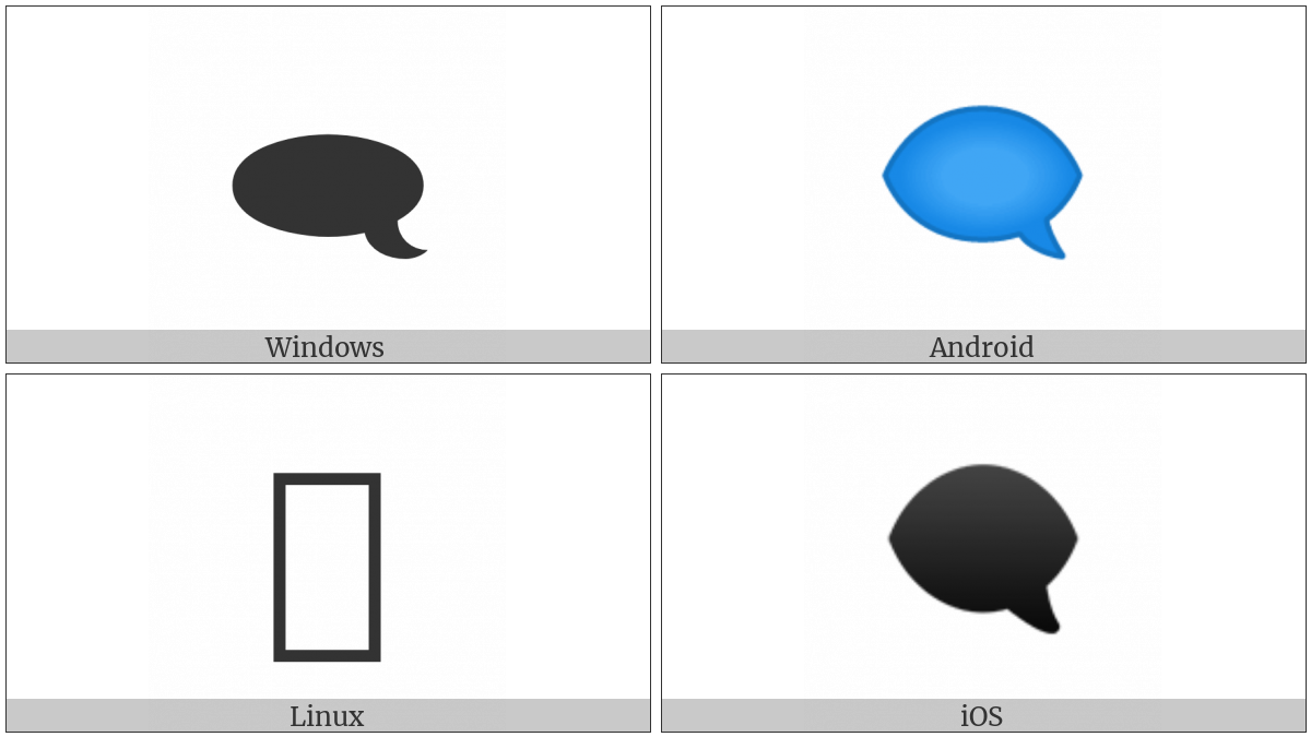 The image below shows how the “Left Speech Bubble” symbol might look like on different operating systems. If the font in which this web site is displayed does not contain the symbol and there is no fallback font able to render it, you can use the image below to get an idea of what it should look like.