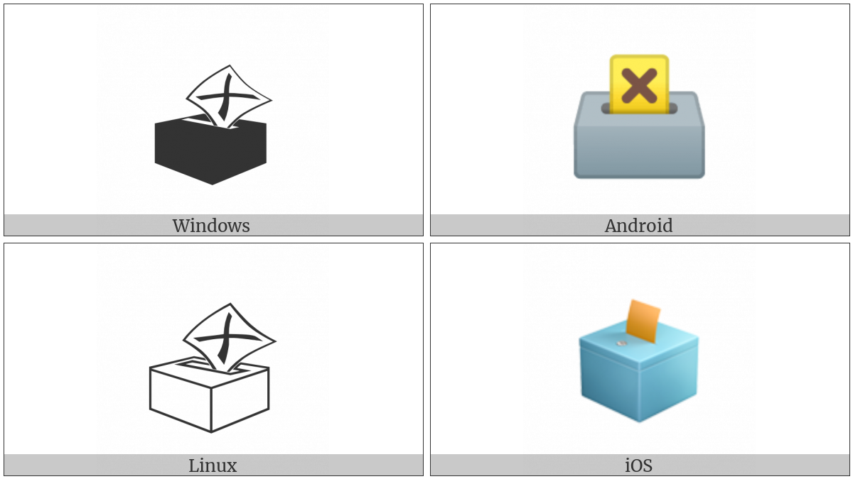 The image below shows how the “Ballot Box With Ballot” symbol might look like on different operating systems. If the font in which this web site is displayed does not contain the symbol and there is no fallback font able to render it, you can use the image below to get an idea of what it should look like.