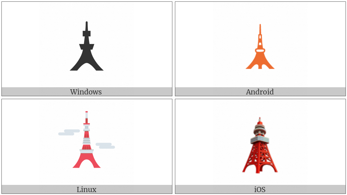 The image below shows how the “Tokyo Tower” symbol might look like on different operating systems. If the font in which this web site is displayed does not contain the symbol and there is no fallback font able to render it, you can use the image below to get an idea of what it should look like.