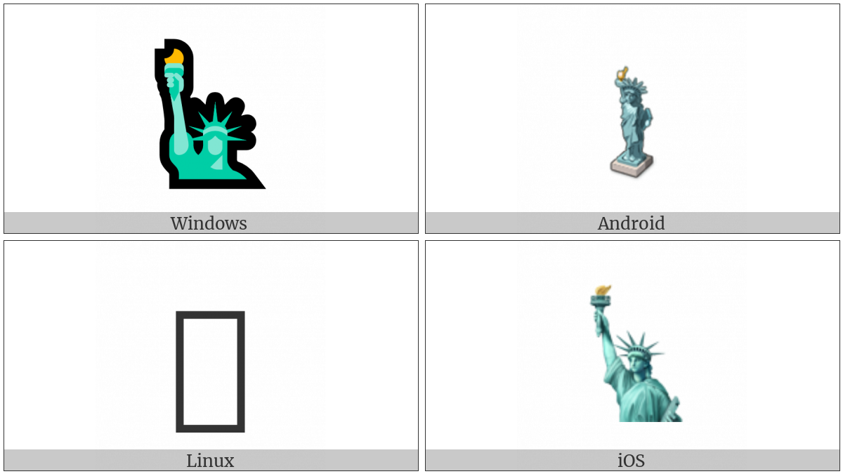 The image below shows how the “Statue Of Liberty” symbol might look like on different operating systems. If the font in which this web site is displayed does not contain the symbol and there is no fallback font able to render it, you can use the image below to get an idea of what it should look like.