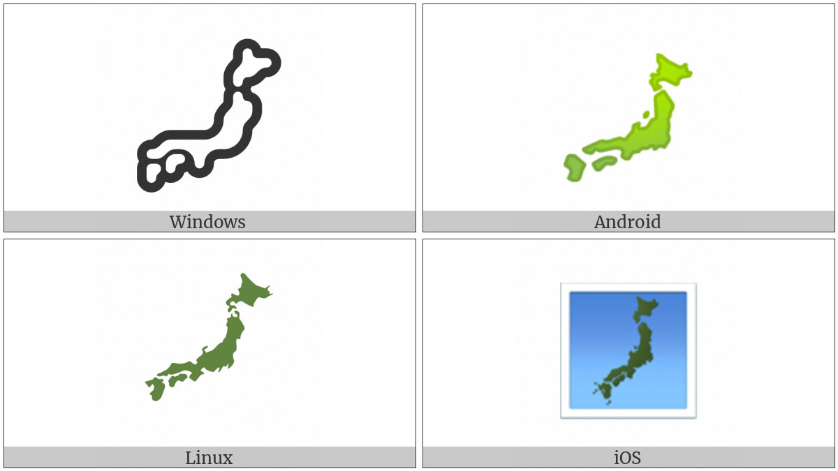 The image below shows how the “Silhouette Of Japan” symbol might look like on different operating systems. If the font in which this web site is displayed does not contain the symbol and there is no fallback font able to render it, you can use the image below to get an idea of what it should look like.