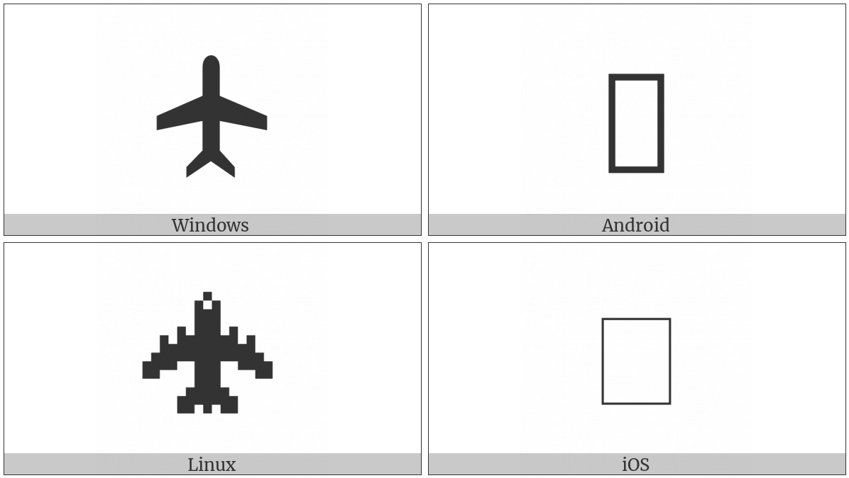 The image below shows how the “Up-Pointing Airplane” symbol might look like on different operating systems. If the font in which this web site is displayed does not contain the symbol and there is no fallback font able to render it, you can use the image below to get an idea of what it should look like.