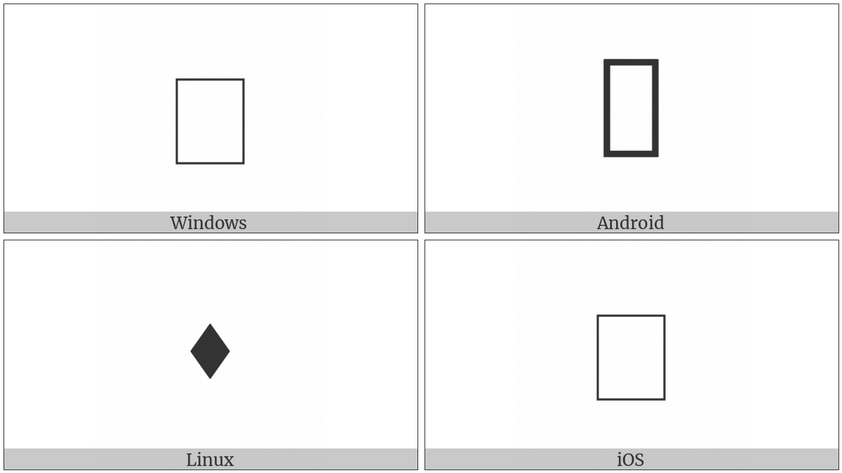 The image below shows how the “Black Medium Small Lozenge” symbol might look like on different operating systems. If the font in which this web site is displayed does not contain the symbol and there is no fallback font able to render it, you can use the image below to get an idea of what it should look like.