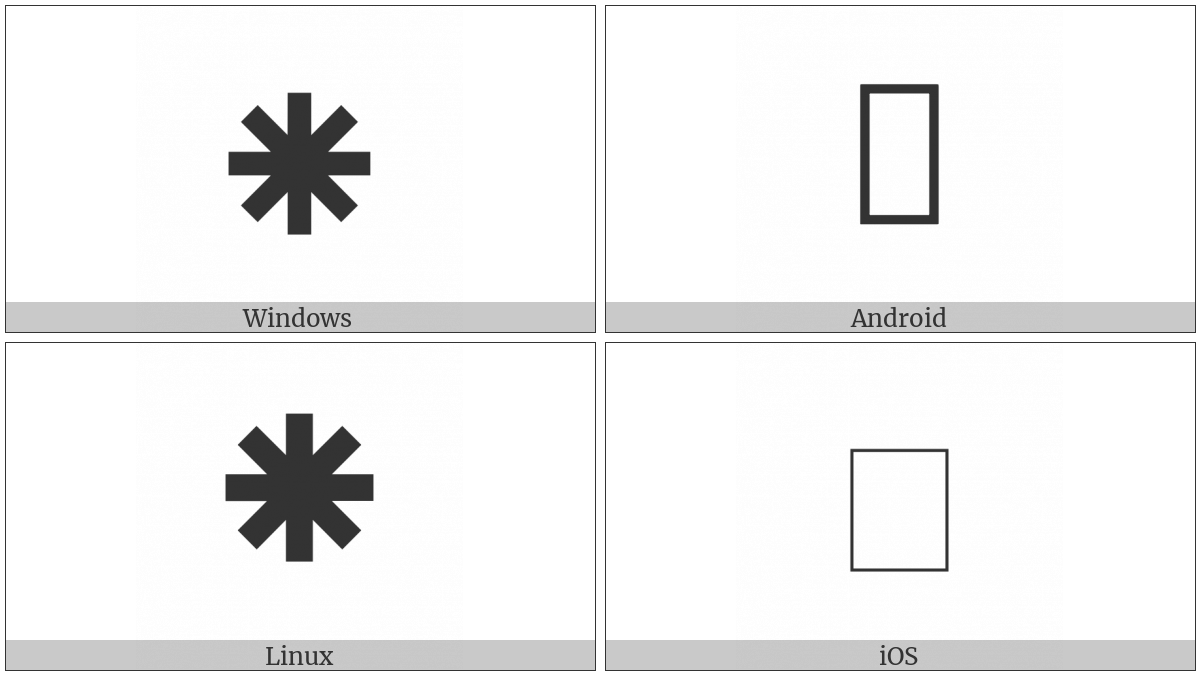 The image below shows how the “Heavy Eight Spoked Asterisk” symbol might look like on different operating systems. If the font in which this web site is displayed does not contain the symbol and there is no fallback font able to render it, you can use the image below to get an idea of what it should look like.