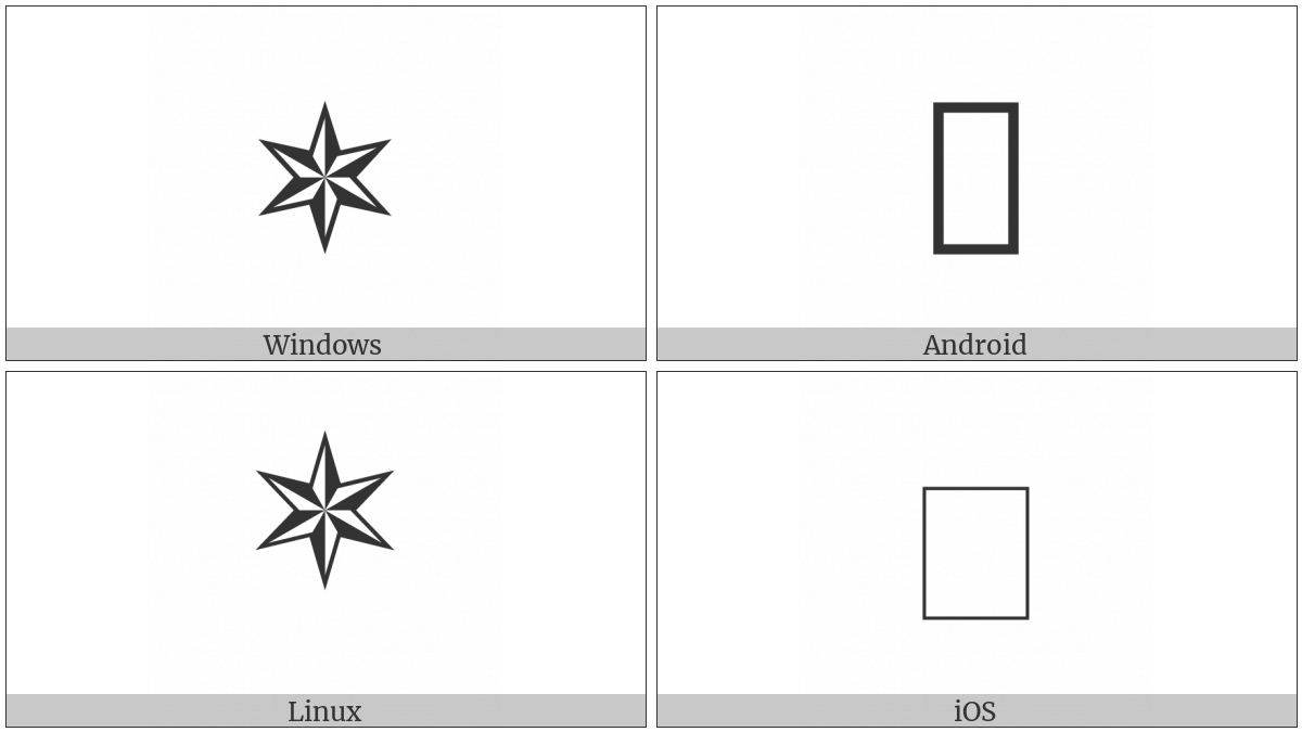 The image below shows how the “Six Pointed Pinwheel Star” symbol might look like on different operating systems. If the font in which this web site is displayed does not contain the symbol and there is no fallback font able to render it, you can use the image below to get an idea of what it should look like.