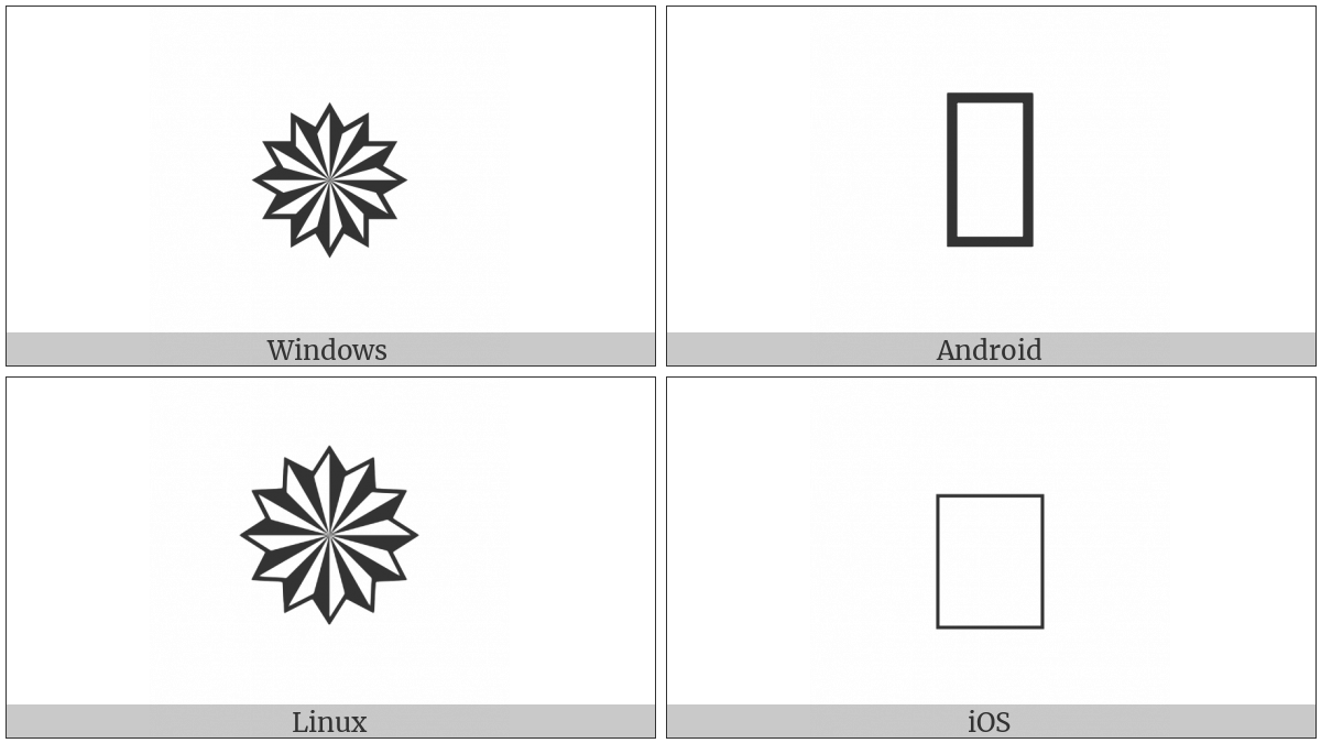 The image below shows how the “Heavy Twelve Pointed Pinwheel Star” symbol might look like on different operating systems. If the font in which this web site is displayed does not contain the symbol and there is no fallback font able to render it, you can use the image below to get an idea of what it should look like.