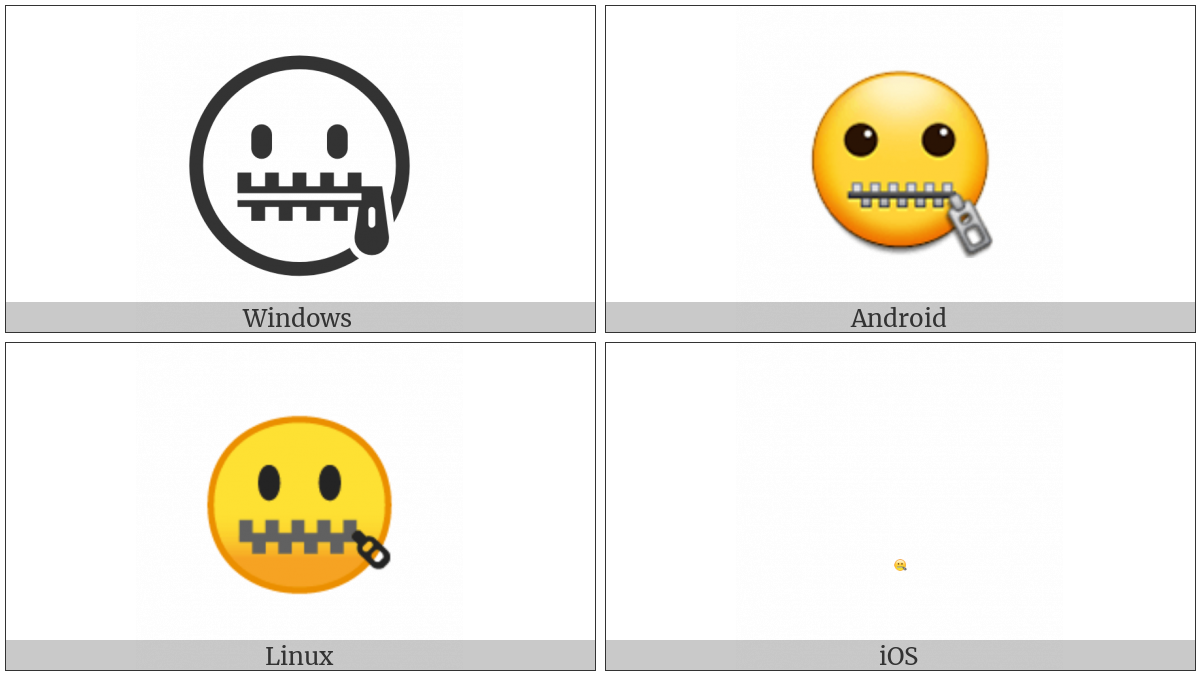The image below shows how the “Zipper-Mouth Face” symbol might look like on different operating systems. If the font in which this web site is displayed does not contain the symbol and there is no fallback font able to render it, you can use the image below to get an idea of what it should look like.