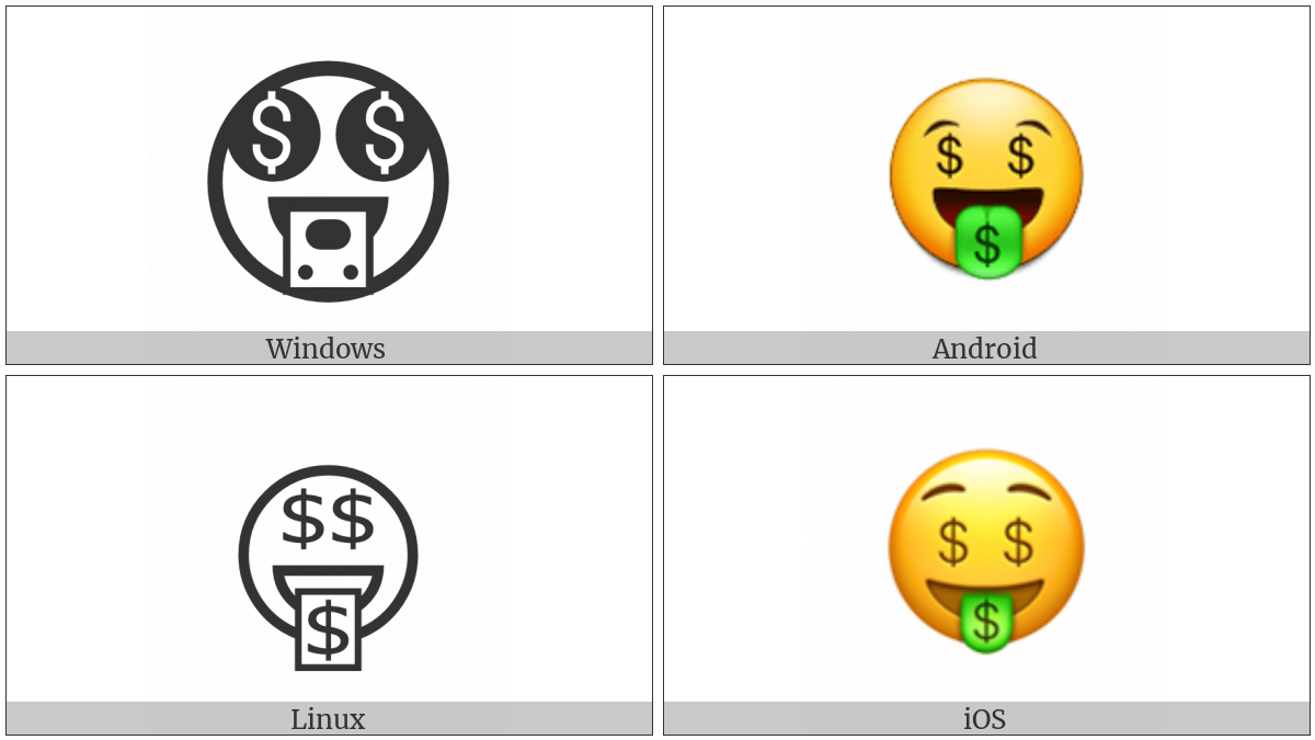 The image below shows how the “Money-Mouth Face” symbol might look like on different operating systems. If the font in which this web site is displayed does not contain the symbol and there is no fallback font able to render it, you can use the image below to get an idea of what it should look like.