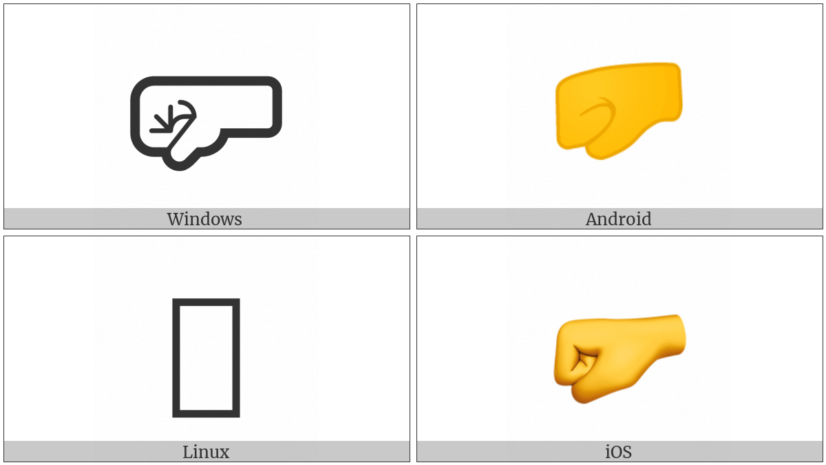 The image below shows how the “Left-Facing Fist” symbol might look like on different operating systems. If the font in which this web site is displayed does not contain the symbol and there is no fallback font able to render it, you can use the image below to get an idea of what it should look like.