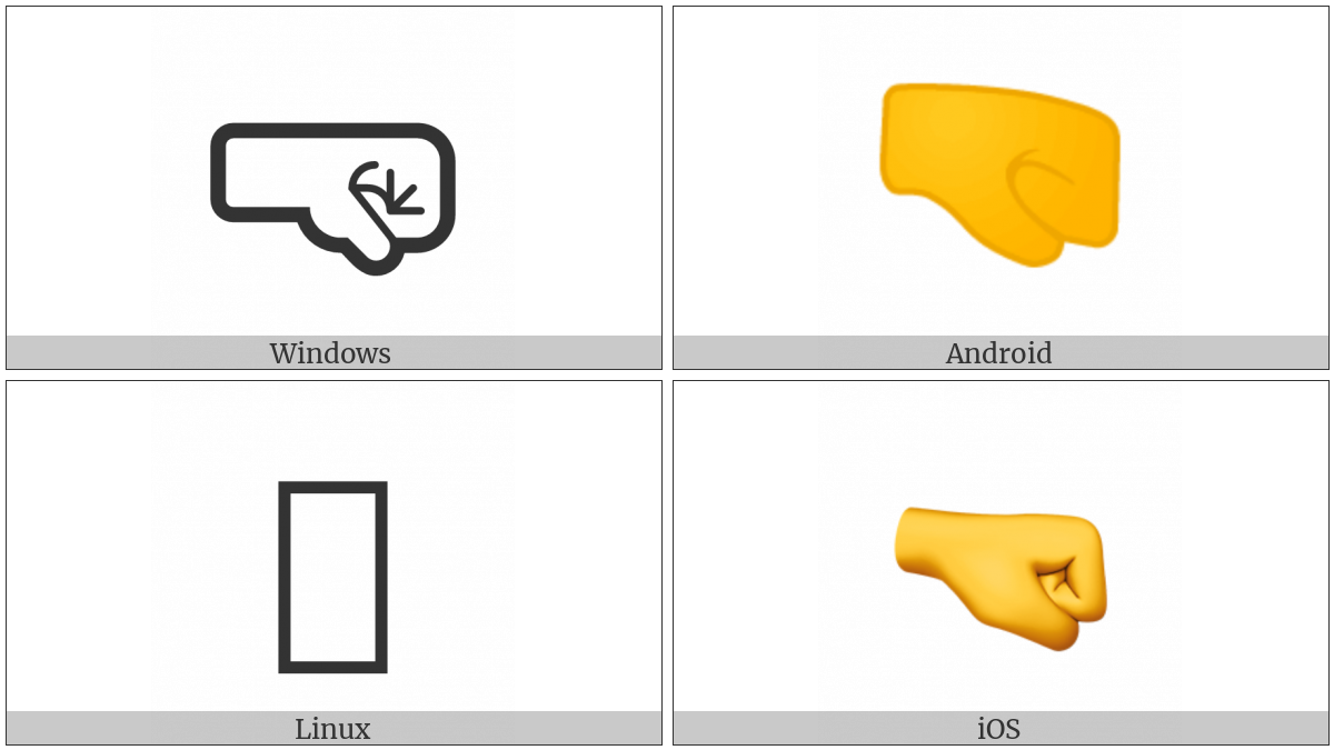 The image below shows how the “Right-Facing Fist” symbol might look like on different operating systems. If the font in which this web site is displayed does not contain the symbol and there is no fallback font able to render it, you can use the image below to get an idea of what it should look like.