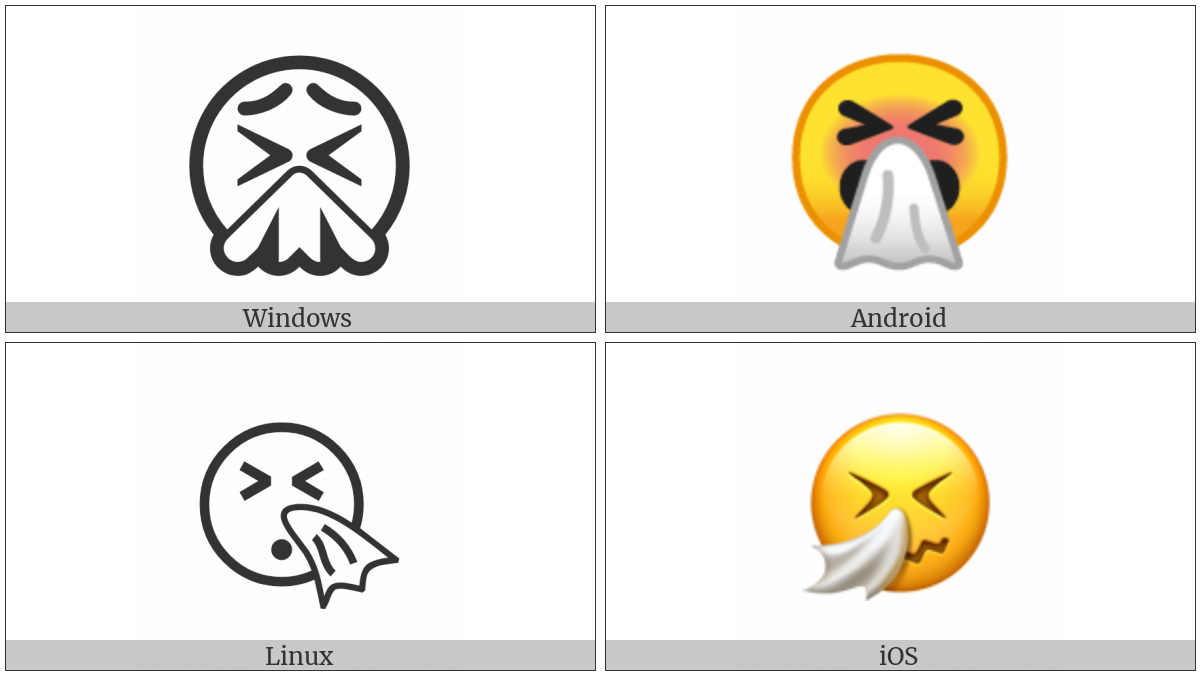 The image below shows how the “Sneezing Face” symbol might look like on different operating systems. If the font in which this web site is displayed does not contain the symbol and there is no fallback font able to render it, you can use the image below to get an idea of what it should look like.