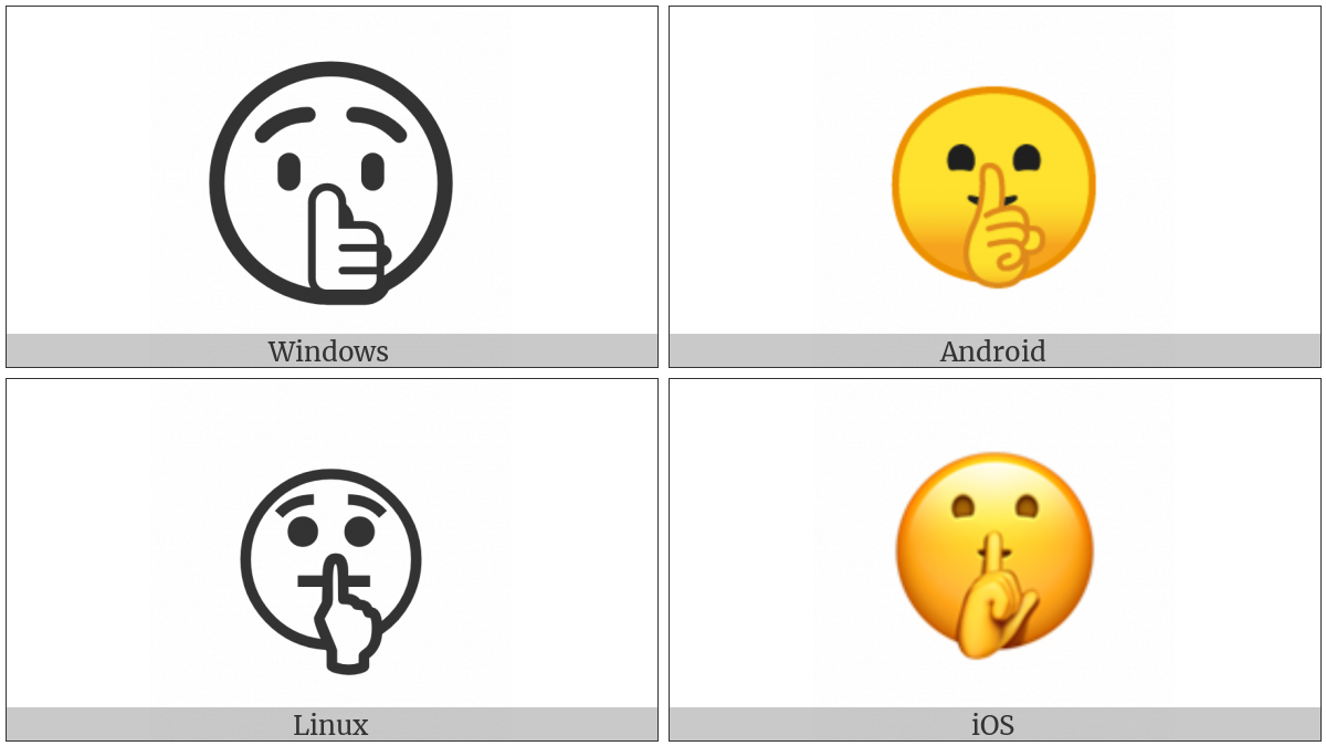 The image below shows how the “Face With Finger Covering Closed Lips” symbol might look like on different operating systems. If the font in which this web site is displayed does not contain the symbol and there is no fallback font able to render it, you can use the image below to get an idea of what it should look like.