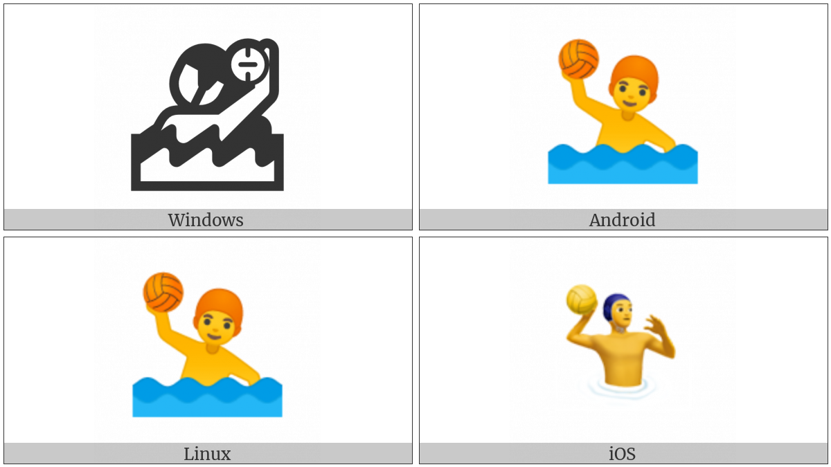 The image below shows how the “Water Polo” symbol might look like on different operating systems. If the font in which this web site is displayed does not contain the symbol and there is no fallback font able to render it, you can use the image below to get an idea of what it should look like.