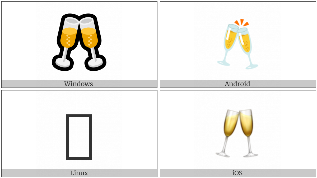 The image below shows how the “Clinking Glasses” symbol might look like on different operating systems. If the font in which this web site is displayed does not contain the symbol and there is no fallback font able to render it, you can use the image below to get an idea of what it should look like.