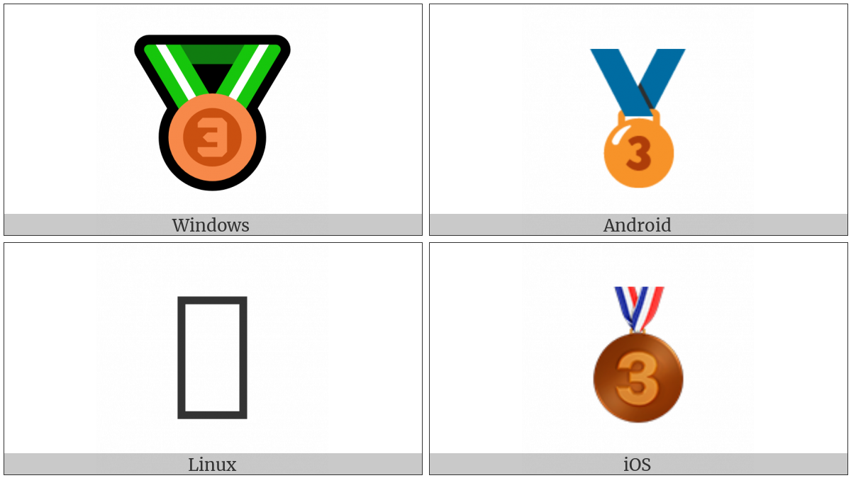 The image below shows how the “Third Place Medal” symbol might look like on different operating systems. If the font in which this web site is displayed does not contain the symbol and there is no fallback font able to render it, you can use the image below to get an idea of what it should look like.
