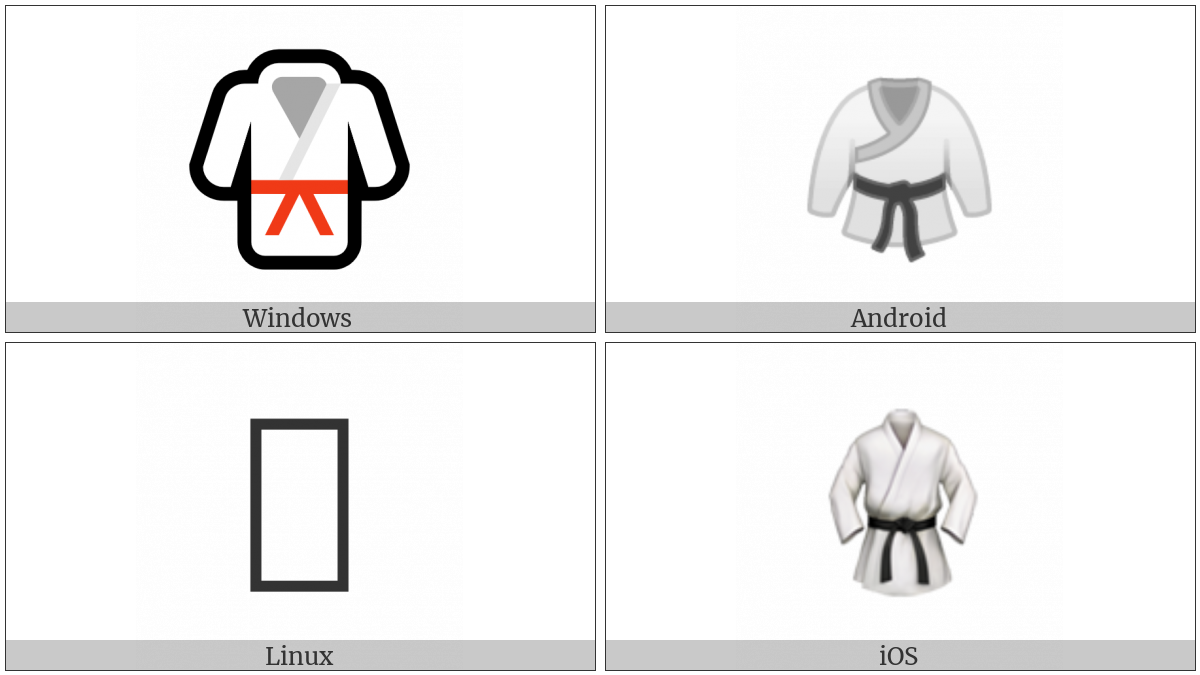 The image below shows how the “Martial Arts Uniform” symbol might look like on different operating systems. If the font in which this web site is displayed does not contain the symbol and there is no fallback font able to render it, you can use the image below to get an idea of what it should look like.