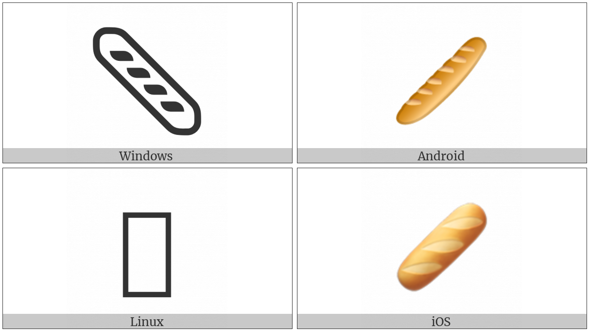 The image below shows how the “Baguette Bread” symbol might look like on different operating systems. If the font in which this web site is displayed does not contain the symbol and there is no fallback font able to render it, you can use the image below to get an idea of what it should look like.