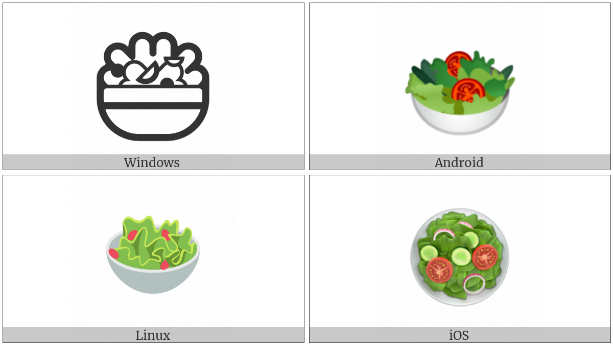 The image below shows how the “Green Salad” symbol might look like on different operating systems. If the font in which this web site is displayed does not contain the symbol and there is no fallback font able to render it, you can use the image below to get an idea of what it should look like.
