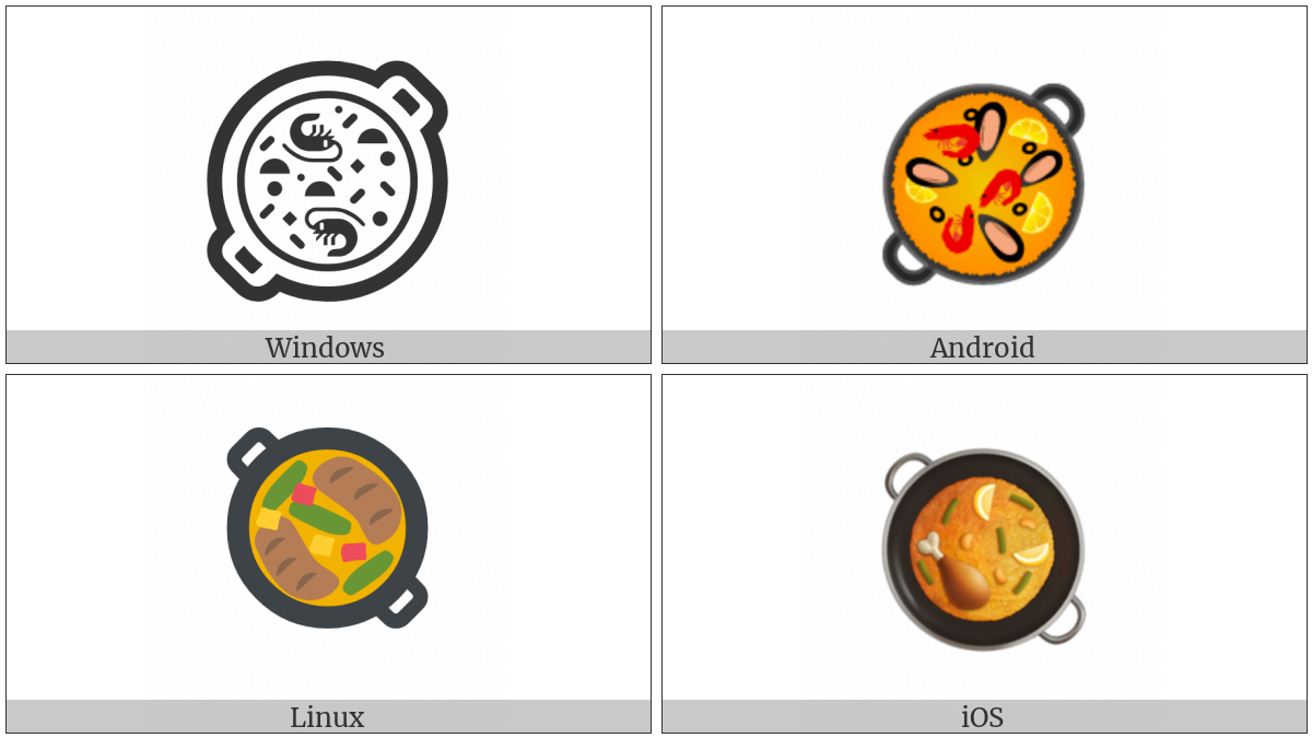 The image below shows how the “Shallow Pan Of Food” symbol might look like on different operating systems. If the font in which this web site is displayed does not contain the symbol and there is no fallback font able to render it, you can use the image below to get an idea of what it should look like.