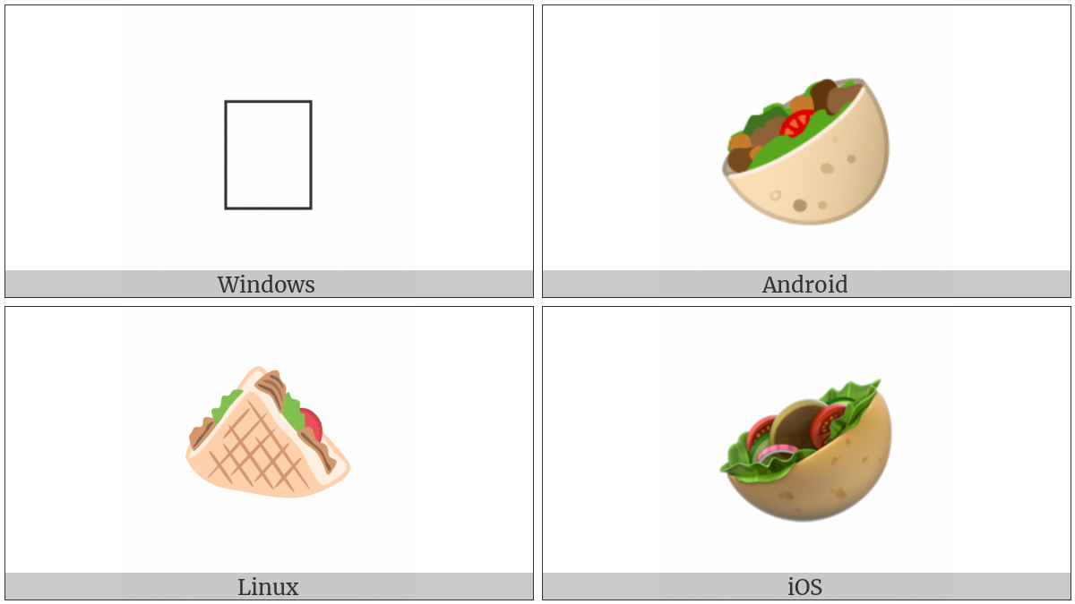 The image below shows how the “Stuffed Flatbread” symbol might look like on different operating systems. If the font in which this web site is displayed does not contain the symbol and there is no fallback font able to render it, you can use the image below to get an idea of what it should look like.