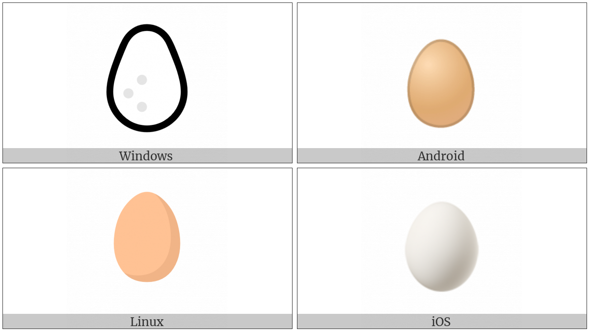 The image below shows how the “Egg” symbol might look like on different operating systems. If the font in which this web site is displayed does not contain the symbol and there is no fallback font able to render it, you can use the image below to get an idea of what it should look like.