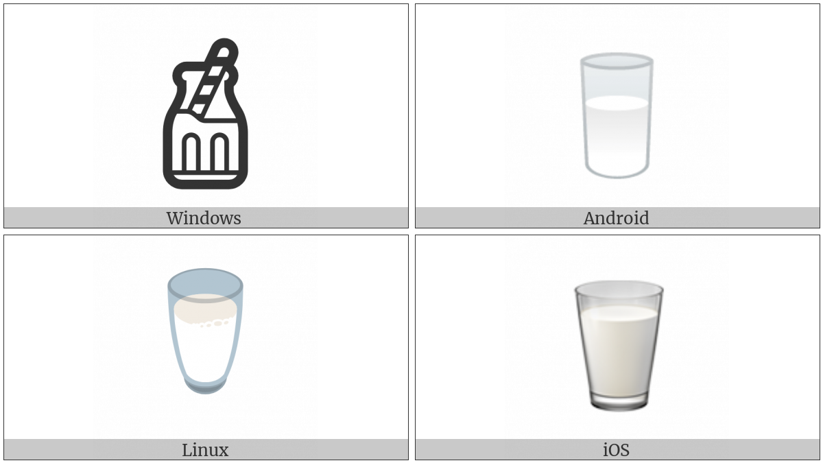 The image below shows how the “Glass Of Milk” symbol might look like on different operating systems. If the font in which this web site is displayed does not contain the symbol and there is no fallback font able to render it, you can use the image below to get an idea of what it should look like.