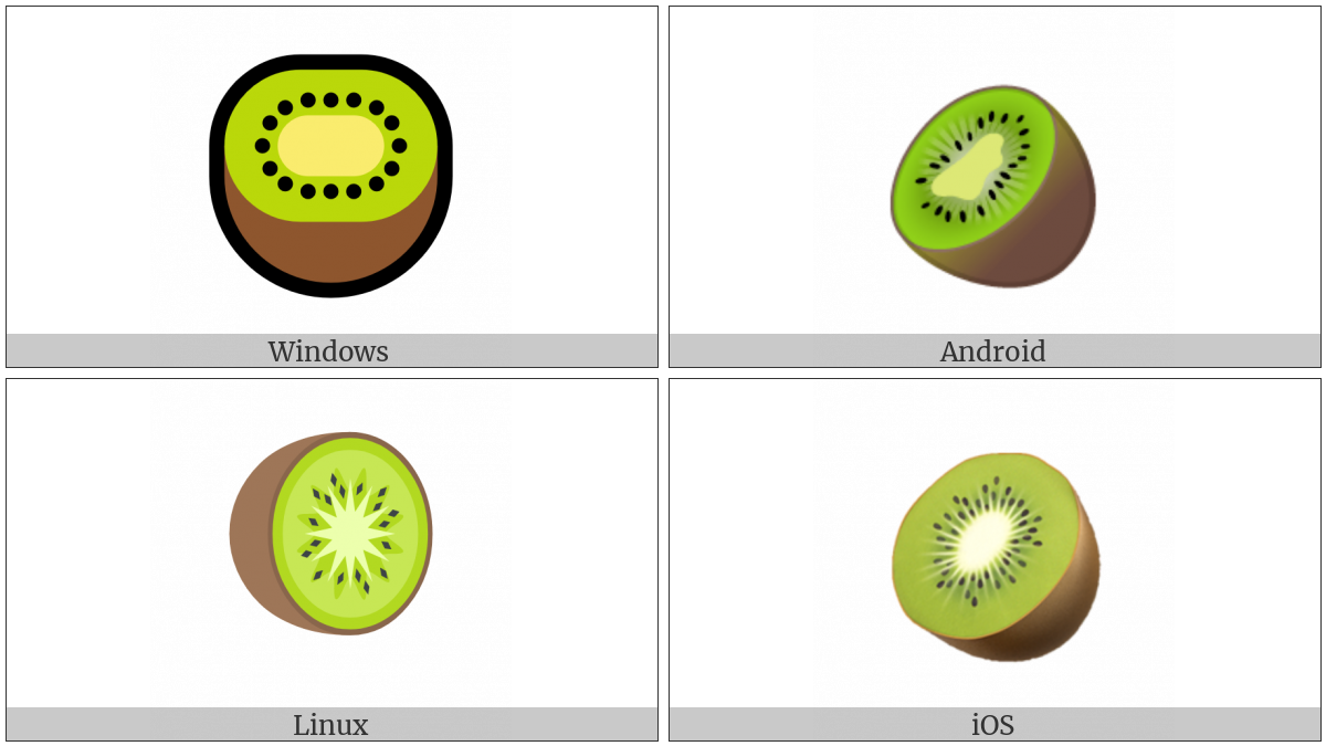The image below shows how the “Kiwifruit” symbol might look like on different operating systems. If the font in which this web site is displayed does not contain the symbol and there is no fallback font able to render it, you can use the image below to get an idea of what it should look like.