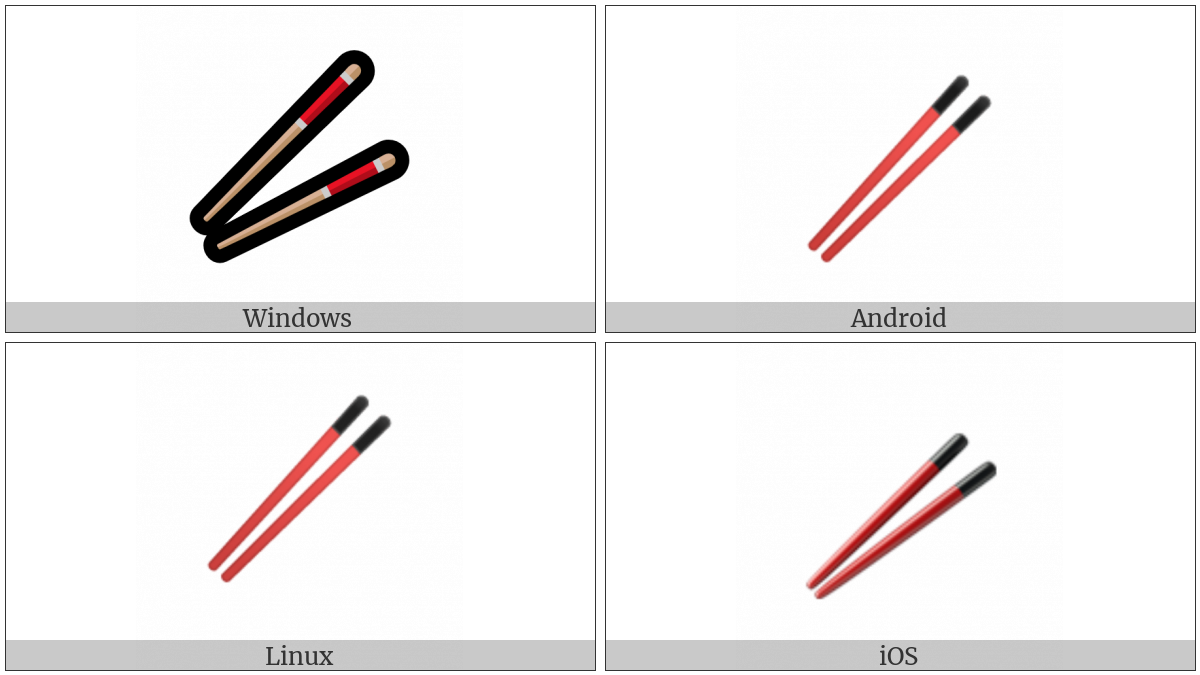 The image below shows how the “Chopsticks” symbol might look like on different operating systems. If the font in which this web site is displayed does not contain the symbol and there is no fallback font able to render it, you can use the image below to get an idea of what it should look like.