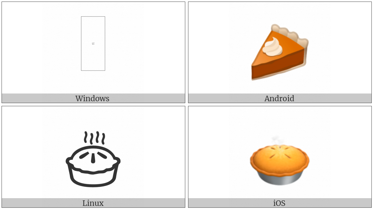The image below shows how the “Pie” symbol might look like on different operating systems. If the font in which this web site is displayed does not contain the symbol and there is no fallback font able to render it, you can use the image below to get an idea of what it should look like.